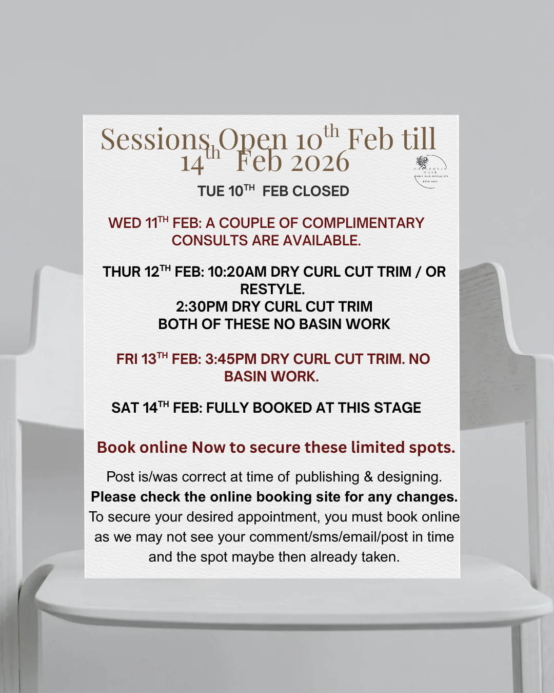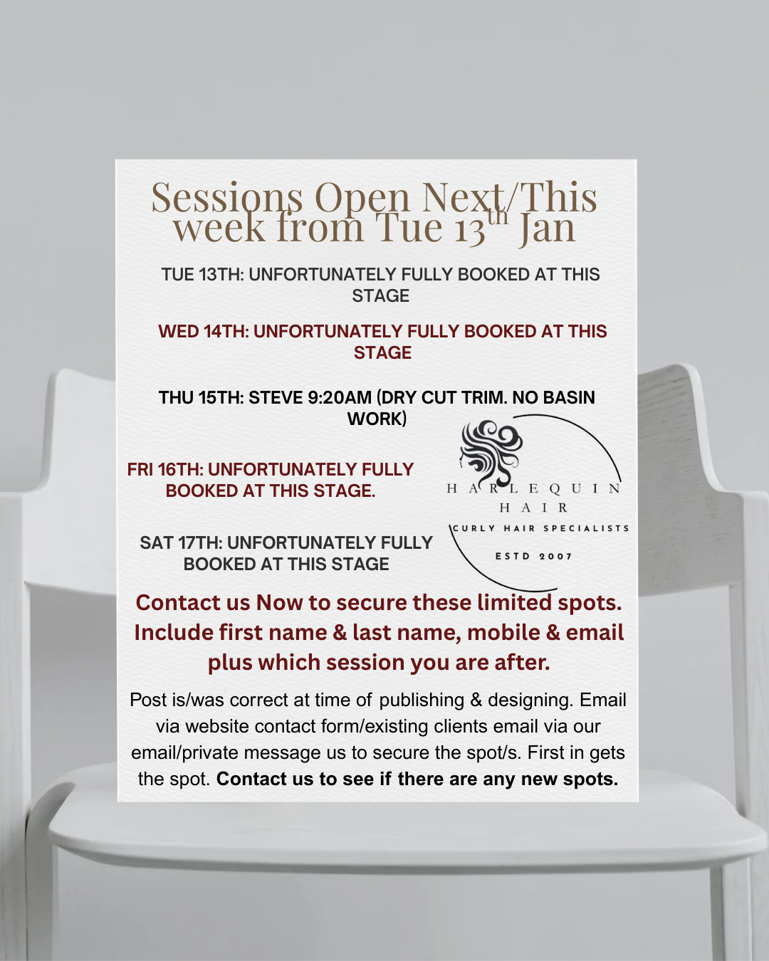 Welcome to Harlequin Hair, where curls come first! We specialise in all things curly — cutting mainly with the dry curl-by-curl method inspired by the Curly Girl approach.
